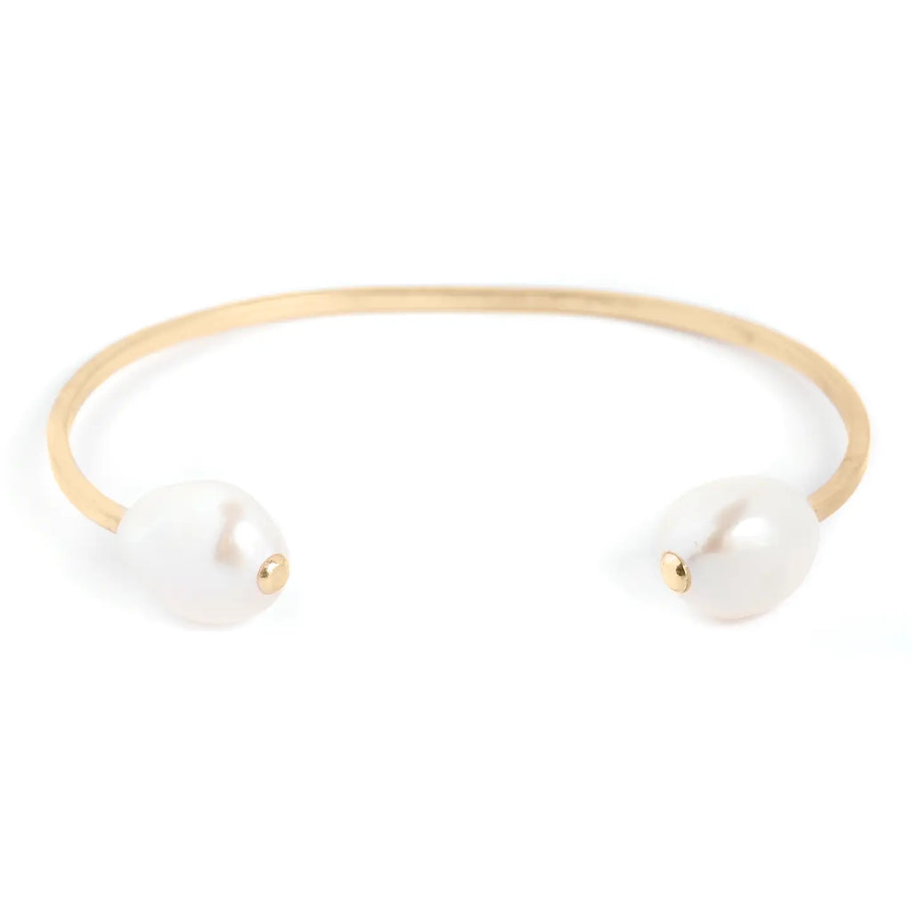 The perfect everyday bracelet. Handcrafted using 14kt yellow gold fill, featuring two white freshwater pearls. This bracelet is adjustable ; it should be more fitted to the wrist so the pearls don't turn around.